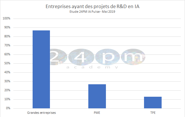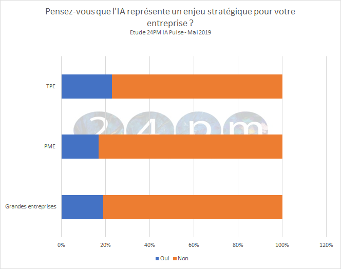 24pm Academy publie les résultats de l’étude 24pm IA pulse 2019 sur les usages des technologies d’intelligence artificielle dans les entreprises françaises qui indique que 22% des entreprises françaises considèrent que l’intelligence artificielle est un enjeu stratégique et 17% d’entre elles déclarent avoir des projets de R&D intégrant de l’intelligence artificielle.