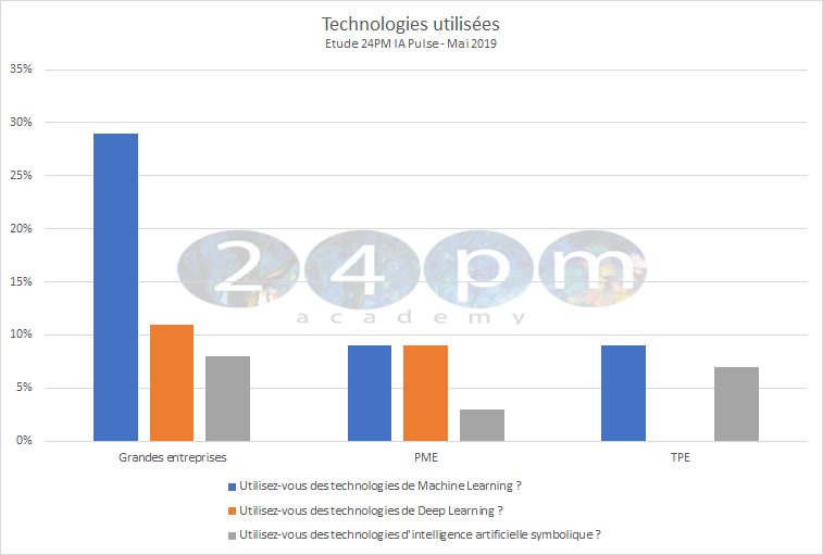 Mais le taux d’utilisation des technologies connexionistes monte à 40% chez les grandes entreprises (dont 11% pour le deep learning).