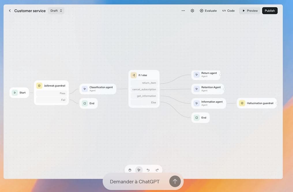 Agent Builder est un canevas visuel qui permet de concevoir et itérer sur des workflows multi-agents. Vous pouvez créer des workflows en glissant-déposant des nœuds, connecter des outils, et configurer des garde-fous personnalisés. Il supporte des prévisualisations de course, la configuration d'éval en ligne, et un versioning complet idéal pour itérer rapidement. Vous pouvez démarrer avec un canevas vierge ou avec des modèles pré-construits.