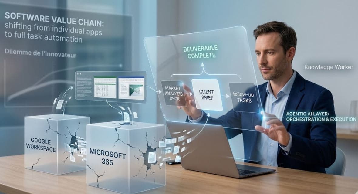 C’est ici qu’intervient le “dilemme de l’innovateur” appliqué non pas au cloud ou au search, mais aux suites de bureau. Le problème pour Microsoft et Google est plus délicat qu’il n’y paraît. Historiquement, leur domination s’est appuyée sur des environnements de travail composés d’applications distinctes, dotées d’interfaces relativement stables, d’habitudes d’usage fortes, et d’un modèle économique simple : l’utilisateur travaille dans Word, Excel, PowerPoint, Docs, Sheets, Gmail, Meet ou Slides, et paie pour cet environnement. Or l’agentique menace de faire passer ces applications du statut de centre de gravité à celui de simple couche d’exécution.