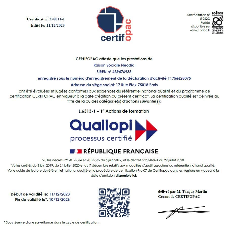 24pm Academy est le service de formation en ligne de l'organisme de formation Neodia, certifié Qualiopi dans la catégorie d'action suivante: Actions de formation